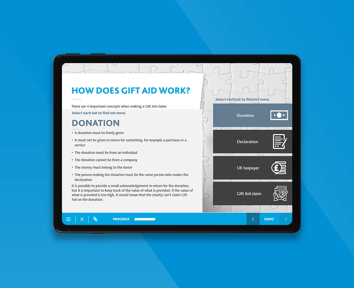 It is applicable to employees who would benefit from a high level understanding of the Gift Aid process, including anyone that interacts with donors in your organisation.